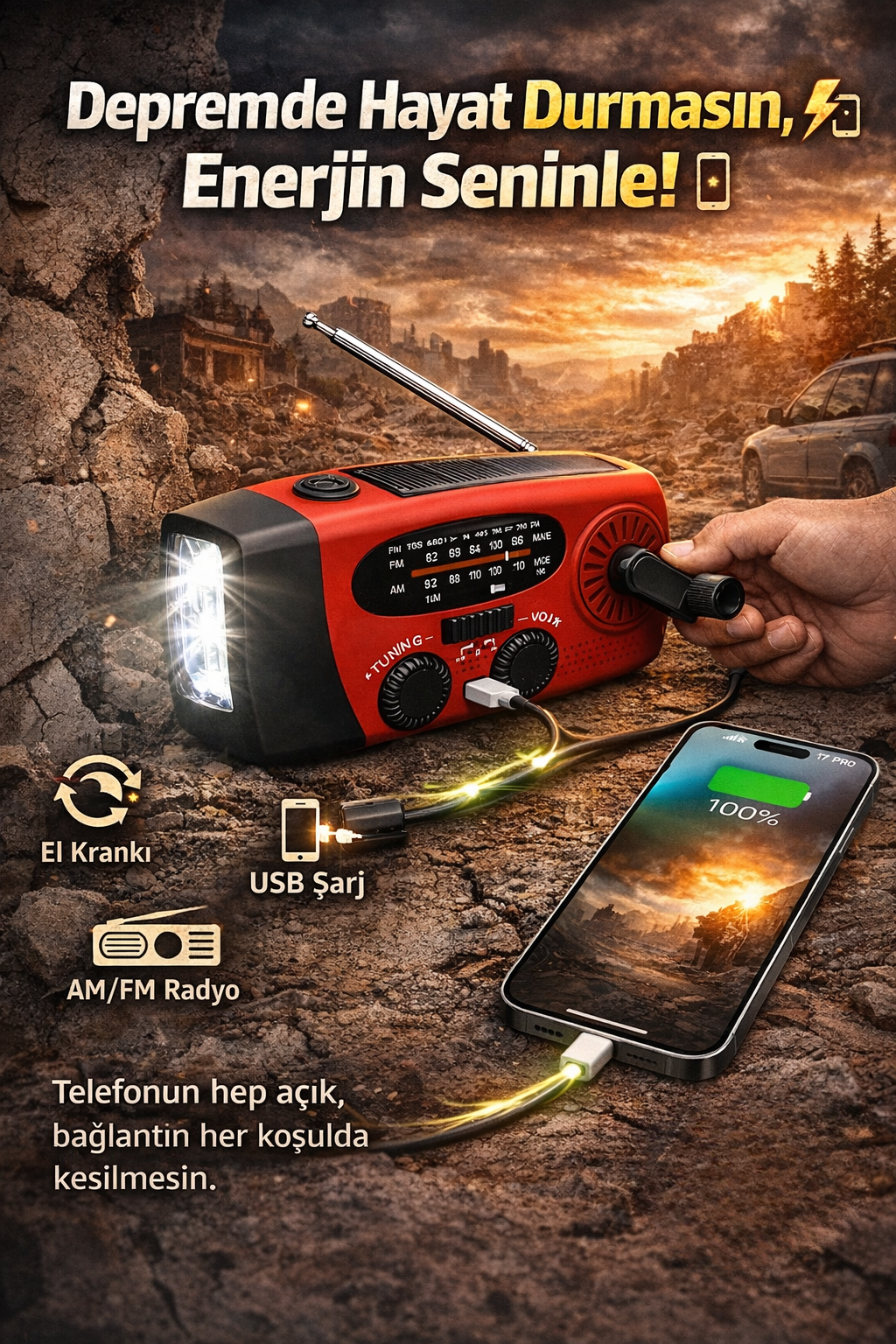 Elektrik kesintileri ve acil durumlar için özel olarak tasarlanan bu cihaz, güneş enerjisi ve el krankı sayesinde kendi elektriğini üretir.